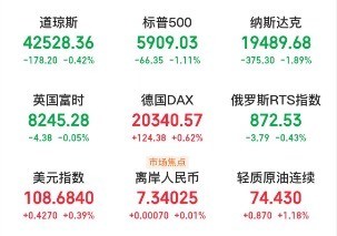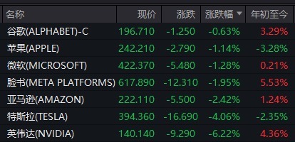 其他科技巨头也普遍下跌,亚马逊下跌2.42%,Meta下跌1.95%,微软下跌1.29%,苹果下跌1.14%,谷歌母公司Alphabet下跌0.7%。